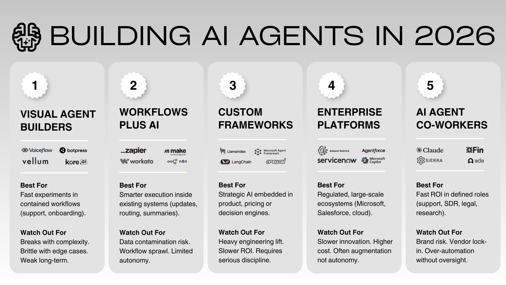 Once you’ve identified your target process leaks, the next decision is architectural. There are at least 5 different way to address these gaps with AI agents, but the choice depends on your strategy.